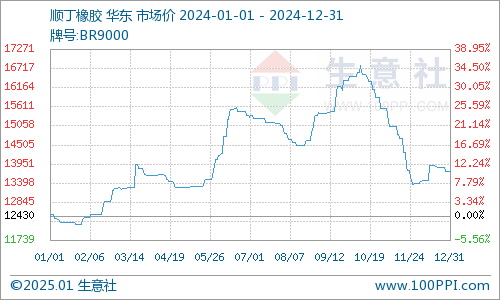 2024年顺丁橡胶本钱大幅上行复古顺丁价钱高企,顺丁橡胶企业利润走低行业开工致体偏低,加之天胶价钱大幅高涨顺丁橡胶替代性需求增多,2024年顺丁橡胶市集所有基本面相对较强,价钱在前三季度大幅上行,四季度受本钱下行、开工普及等影响下个高位回落伍区间整理为主。据交易社监测,完了2024年12月31日顺丁橡胶市集价钱在13720元/吨,较年头的11739元/吨高涨了10.38%;周期内高点在10月初的16810元/吨,周期内低点在1月底的12200元/吨。