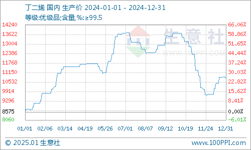 2024年原料丁二烯装配开工偏低,一方面新投产能开释不班师,另一方面东南亚部分丁二烯装配临时泊车,导致国表里市集丁二烯资源偏紧,丁二烯价钱大幅走高。四季度受天津某装配投产预期影响,丁二烯价钱高位回落。据交易社监测,完了2024年12月31日国内丁二烯价钱在10800元/吨,较年头的8575元/吨高涨了%,周期内高点在7月初的13725元/吨。