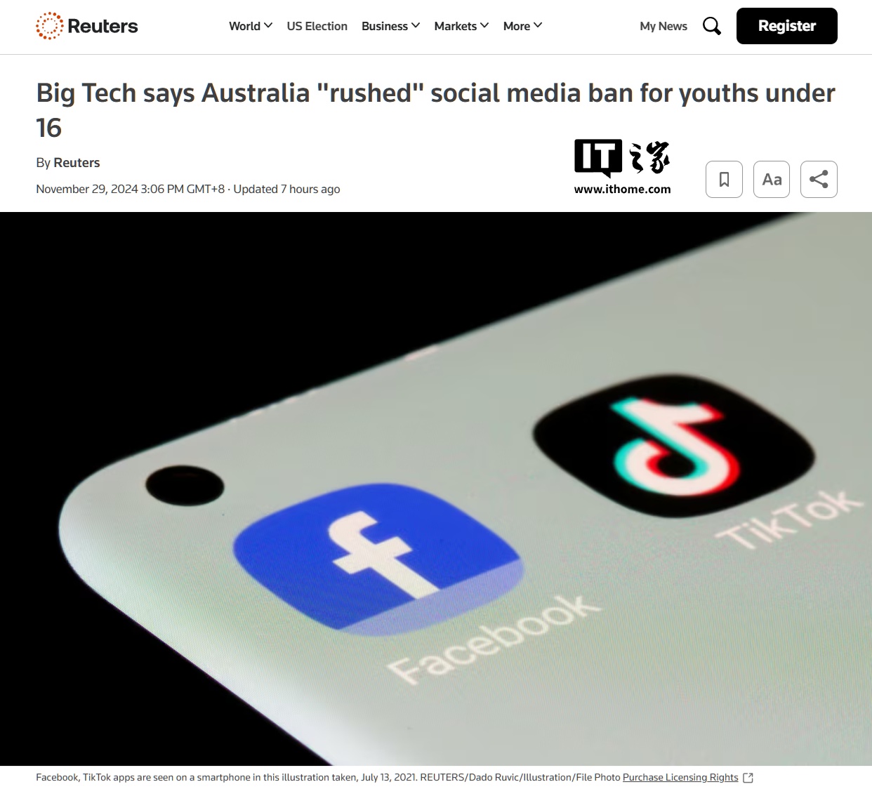 IT之家 11 月 29 日音书,据路透社报谈,在澳大利亚通过了大家最严的“16 岁以下禁用搪塞媒体”法律后,科技巨头们纷纷暗意锋利反对,称其不容 16 岁以下青少年使用搪塞媒体的作念法过于仓猝中。